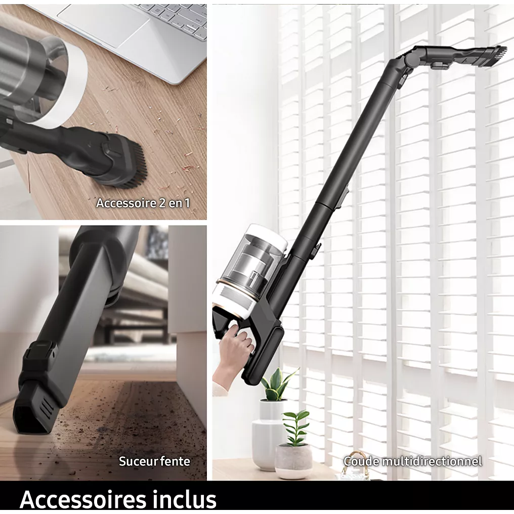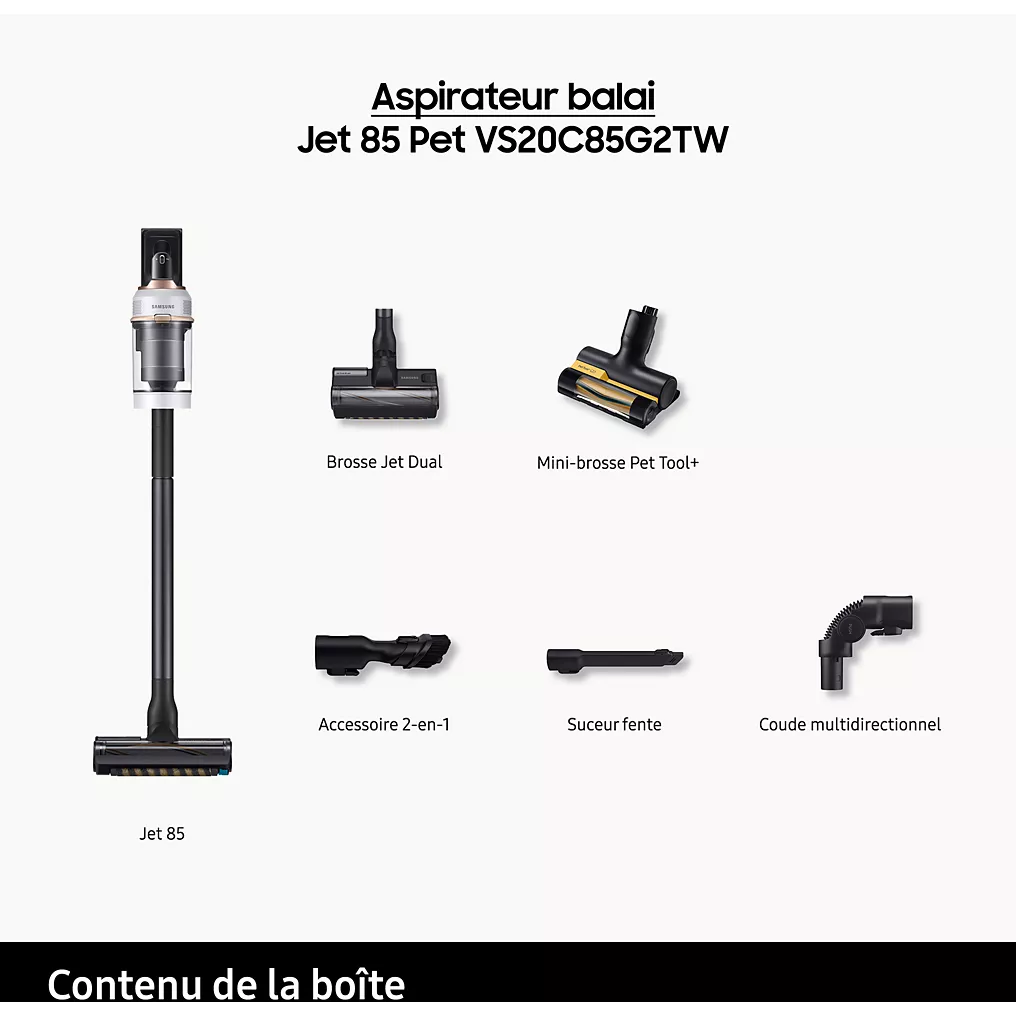Pour s’adapter à toutes les situations, Samsung fournit plusieurs accessoires utiles avec le Jet 85 Pet :