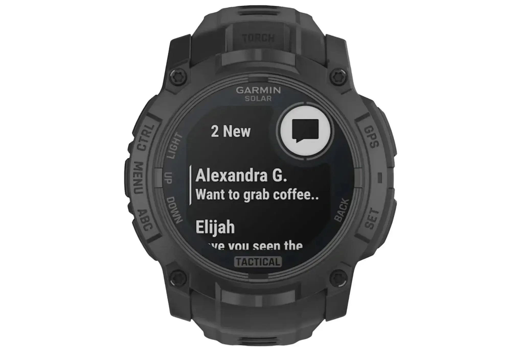 Lorsqu’elle est couplée à un smartphone compatible, la montre affiche les notifications d’appels, de messages, de courriels et d’applications. Le tout peut être configuré selon les besoins : notifications complètes, silencieuses ou en mode tactique restreint.