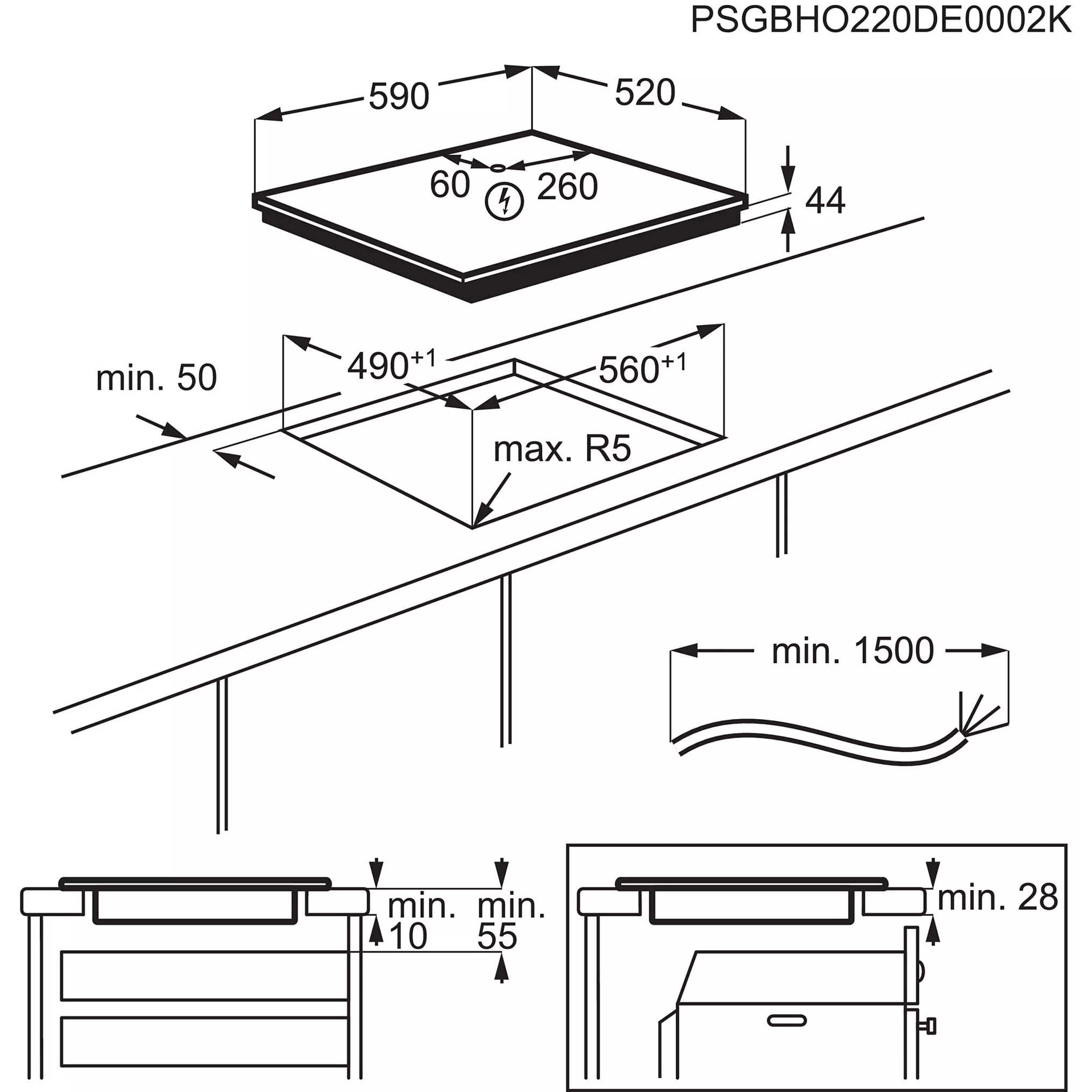 | Dimensions | Dimensions l x h x p 59 x 4.4 x 52 cm, Longueur du cordon d'alimentation 15,00 cm, LxHxP (encastrement) 56 x 4.4 x 49 cm |