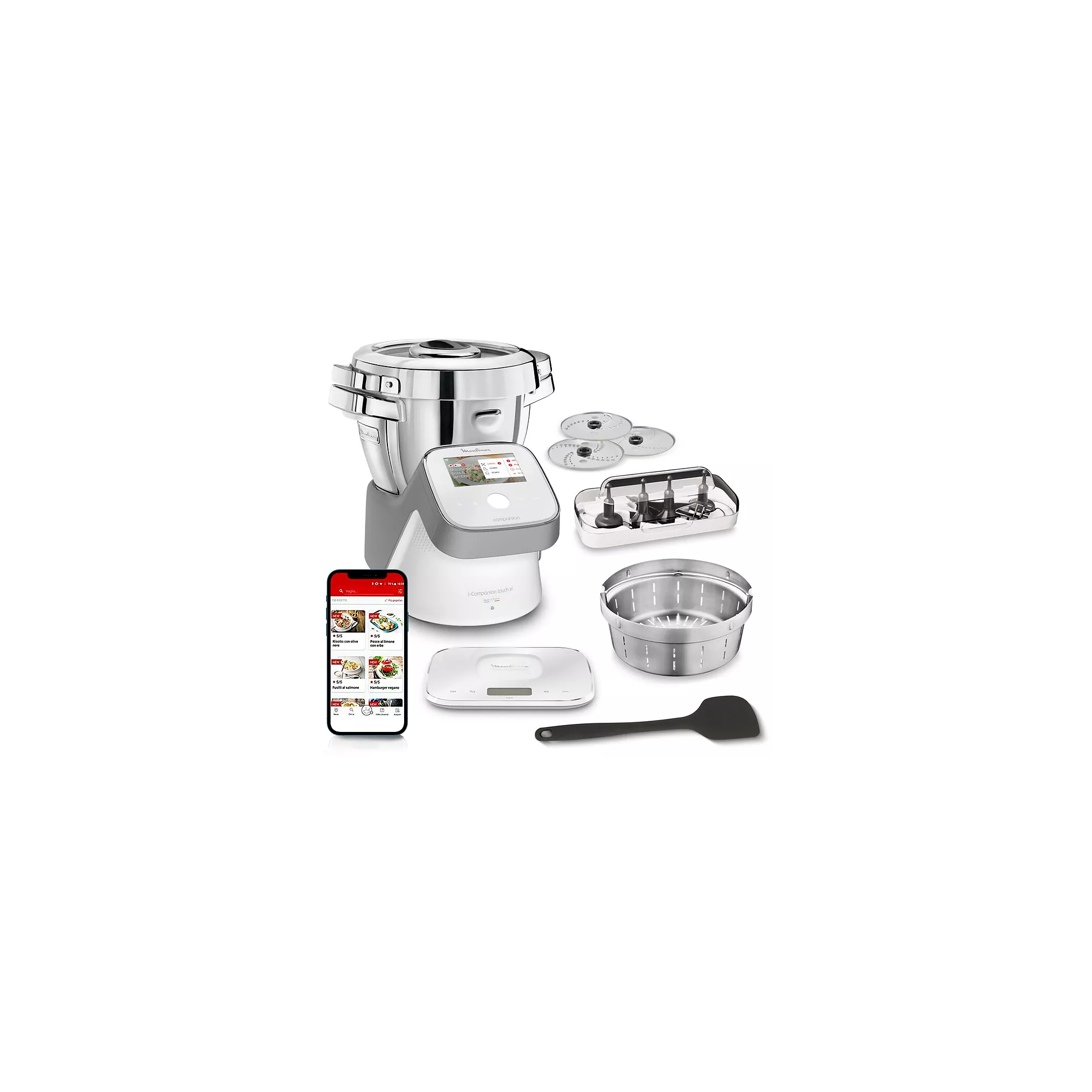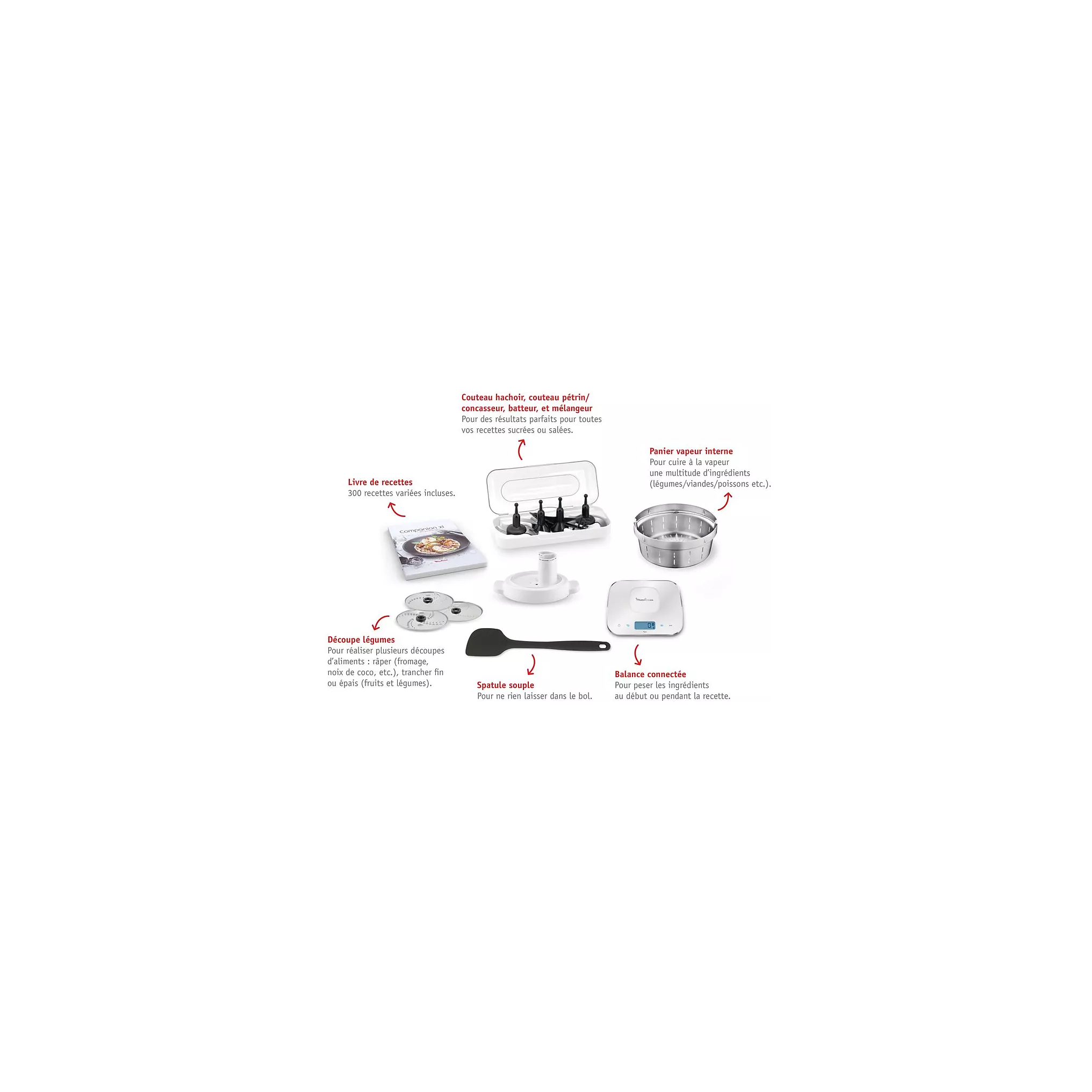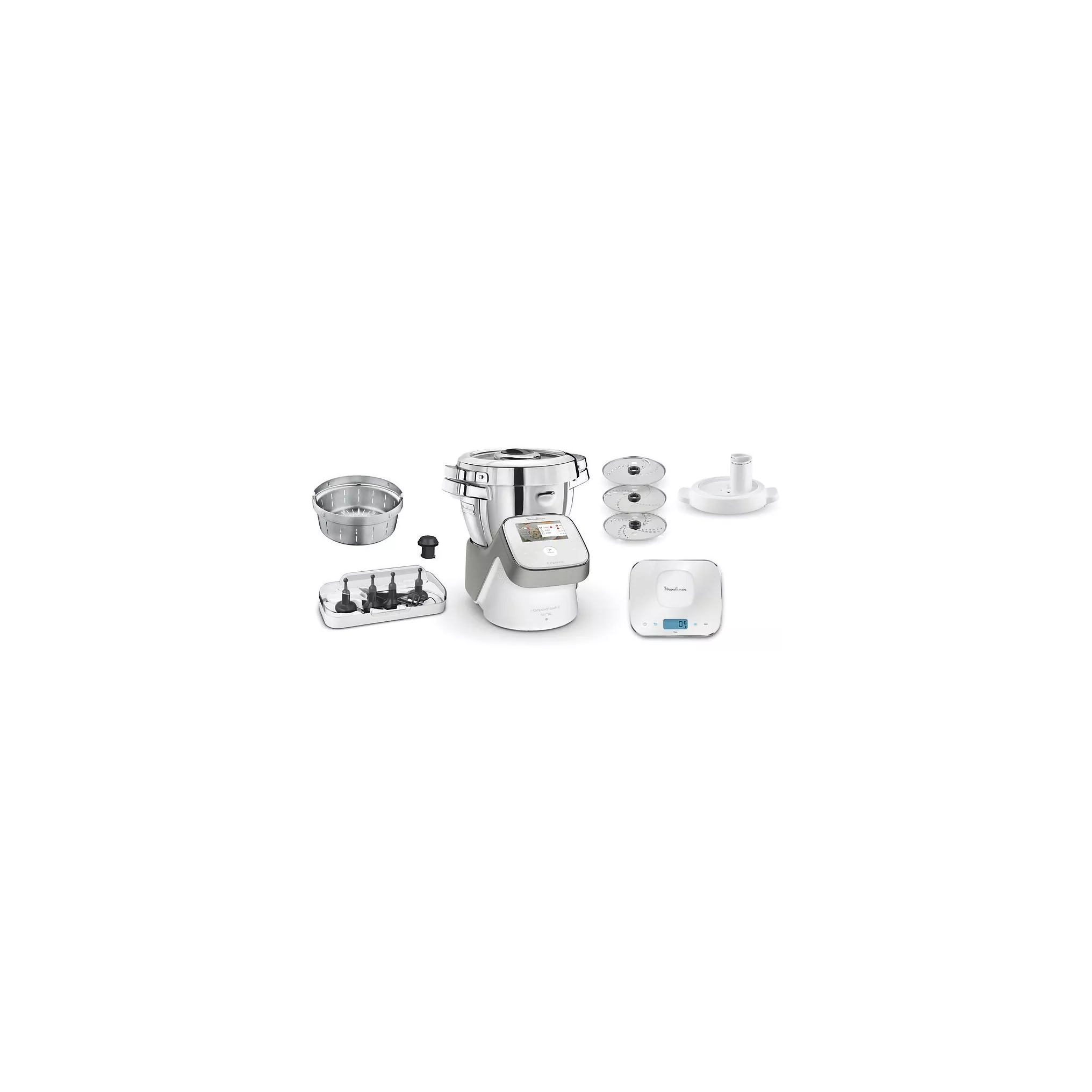 URL SCENE7Le robot cuiseur MOULINEX I-Companion Touch XL HF938E00 est équipé de 8 accessoires inclus : couteau hachoir, couteau pétrin/concasseur, batteur, mélangeur, panier vapeur, accessoire fond plat, découpe légumes pour réaliser jusqu’à 5 types de découpe, et une balance de cuisine connectée. Grâce à celle-ci, vous pouvez peser vos ingrédients, et votre robot vous proposera des recettes adaptées. Très pratique quand on veut finir les restes du frigo !
