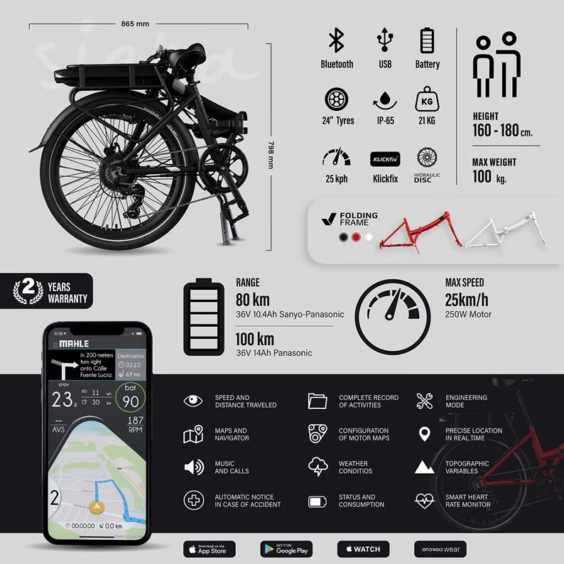 Le cadre du Siena est fabriqué en aluminium léger et robuste, garantissant résistance et durabilité. Le mécanisme de pliage est rapide et intuitif, permettant de ranger le vélo dans un espace restreint ou de le transporter facilement dans une voiture ou un ascenseur.